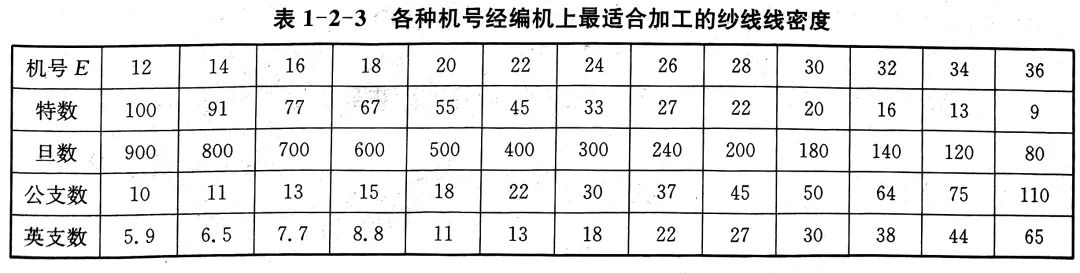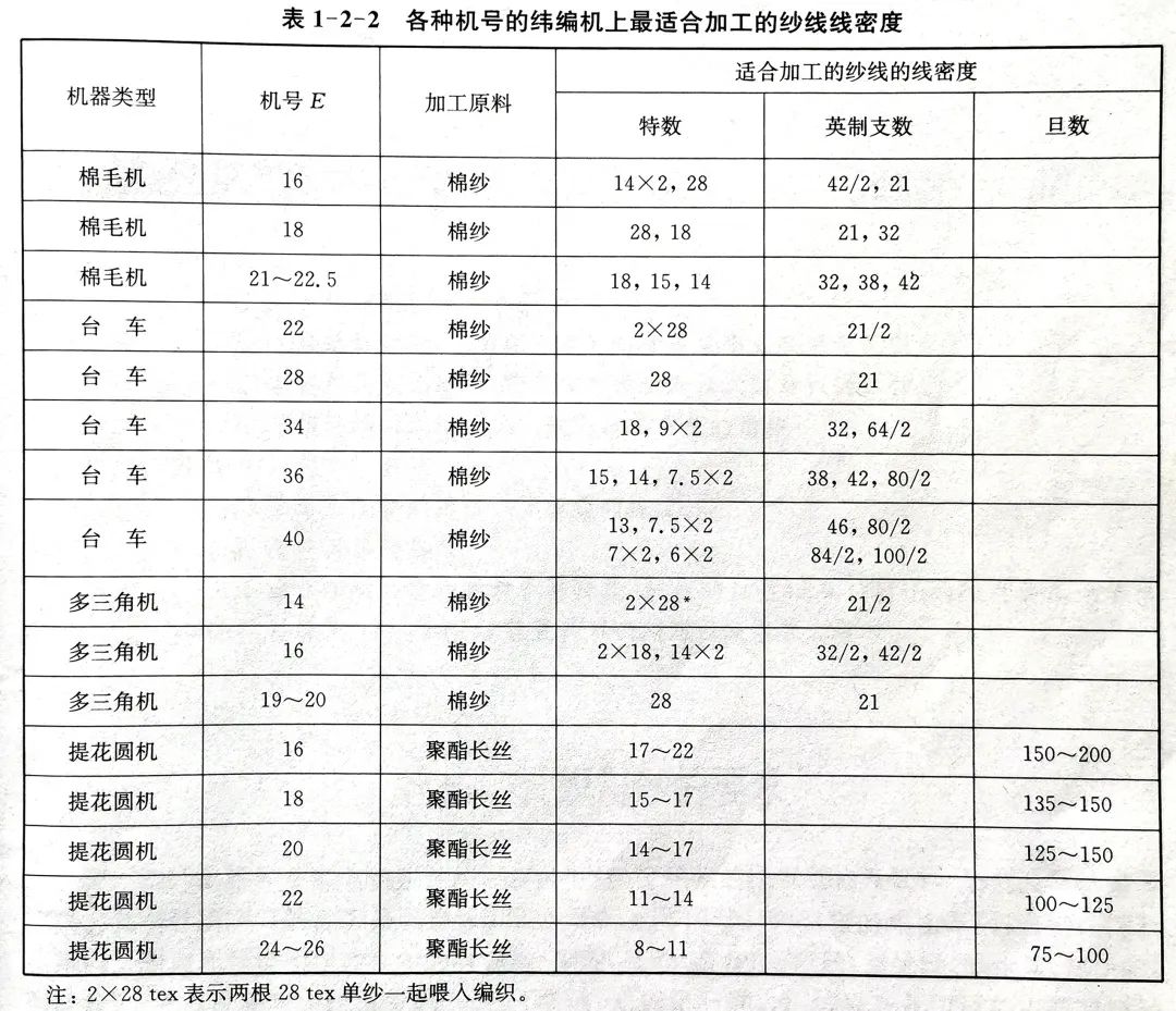 在实际生产中,一般根据织物的有关参数和经验确定机号的针织机上最适合加工的纱线线密度,如表1-2-2所列为各种机号的纬编机上最适合的纱线线密度,表1-2-3所列为各种机号的经编机上最适合的纱线线密度。